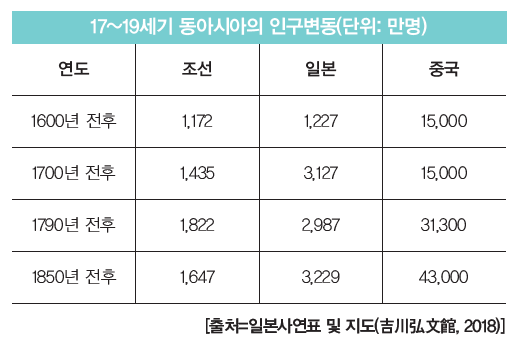동아시아의 인구는 임진왜란으로 잠시 주춤하기도 했지만 농업기술의 발전으로 15세기부터 조선을 제외하고 인구가 팽창하였다. 조선은 왜란과 호란의 여파로 극심한 사회분열과 빈곤에 따른 민심의 이반으로 긴 암흑기를 거쳤다. 그 사이에 중국과 일본은 인구성장을 계기로 자본을 축적하여 번영을 이루었다.