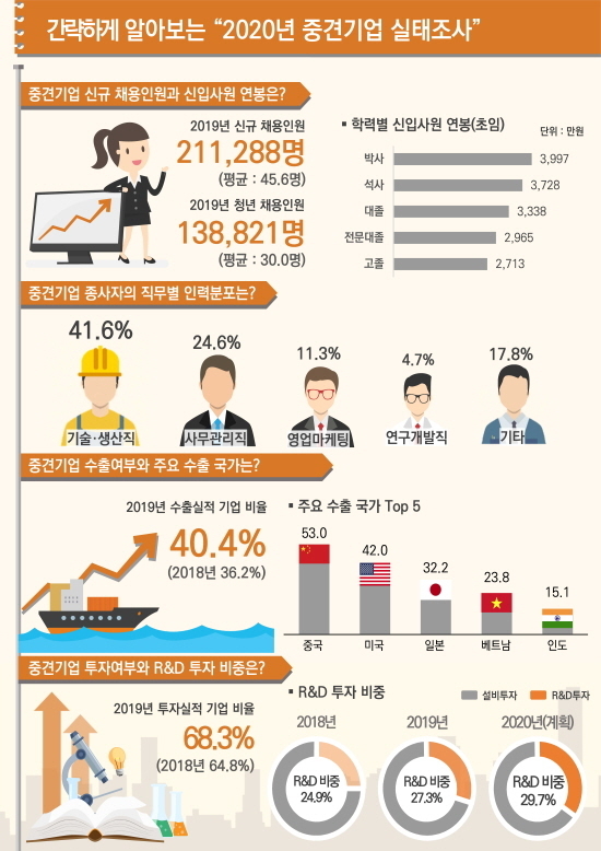 지난해 중견기업 신규채용 인원은 21.1만명으로 전년대비 17.1% 증가했다. 이 가운데 청년(만 15~34세) 채용은 13.9만명(전년 11.2만명)으로 전체의 65.7%를 차지했다.