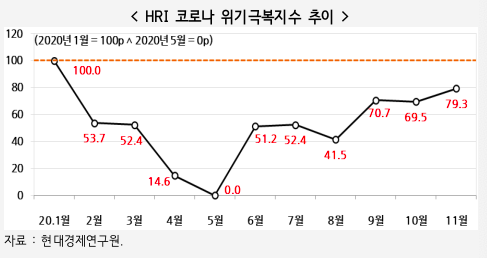 17일 현대경제연구원은 11월 기준 'HRI 코로나 위기극복지수'는 코로나 경제충격이 발생한 이후 가장 높은 수준으로, 79.3% 정도 회복되었다고 밝혔다. 역으로 말하면 코로나 이전의 경제 상황으로 돌아가기 위해서는 경제 전반의 나머지 20.7%의 생산력을 극복해야 한다는 뜻이다.