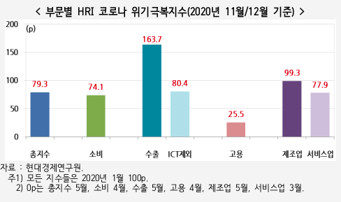 현대경제연구원이 소비(내수), 수출, 고용, 산업생산 등 4개 부문에서 지수를 계산한 결과에 따르면 소비보다는 수출이, 산업생산에서는 서비스업보다 제조업이 각각 회복세가 강한 것으로 분석됐다.