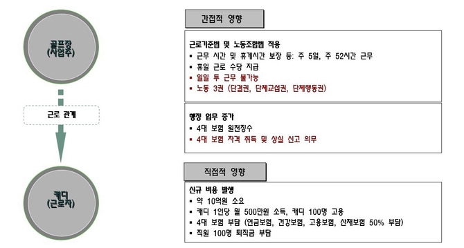 캐디가 근로자가 되면 근로기준법 및 노동조합법이 적용이 되어서 주5일, 주52시간 근무가 적용되어야 하며, 휴게시간 등이 보장되어야 한다. 또한 휴일에 근무할 경우에는 근로 수당을 지급해야 할 것이며, 주52시간을 초과하는 근무에 대해서도 추가수당을 지급해야 한다.