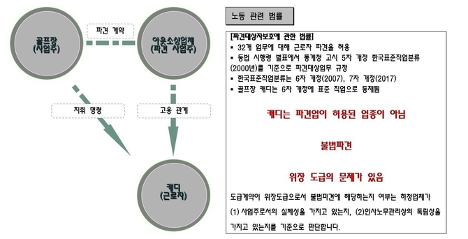 노무법인 한수의 박진호 대표노무사에 따르면, 그래서 업계에서 이를 위장도급이라고 용어를 사용하고 있으며, 이는 불법파견이라는 말과 같다. 도급계약이 위장도급, 불법파견에 해당하는 지 여부는 고용노동부 지침에 따르면, 하청업체가 사업주로서의 실체성을 가지고 있는지, 하청업체가 인사노무관리상의 독립성을 가지고 있는 지를 기준으로 판단한다.