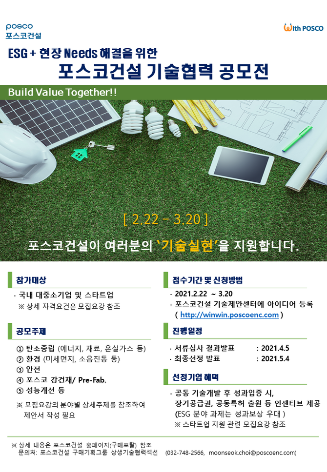 포스코건설은 우수한 아이디어와 기술을 보유한 국내 중소기업들을 육성하고, 미래의 건설기술 발전에 기여하기 위해 `현장 니즈 해결을 위한 기술협력 공모전`을 개최한다고 23일 밝혔다. 특히 이번에는 ESG 관점의 현장 개선과 ESG 경영관리 방안 등 ESG 부분을 확대해 실시한다.