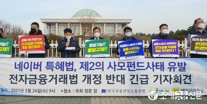 (조세금융신문=진민경 기자) 금융노조와 시민단체가 네이버와 카카오 등 빅테크 업체에 금융업을 허용하는 전자금융거래법 개정안의 폐기를 촉구했다.