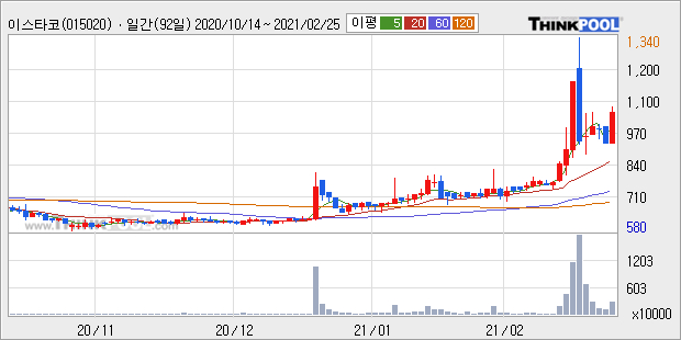 이스타코는 2019년 매출액 238억원과 영업이익 39억원을 기록했다. 전년대비 매출은 296.3% 상승했고, 영업이익은 흑자전환했다. 이 회사의 매출액 증감률과 영업이익 증감률은 각각 코스피 상위 1%, 상위 2%에 해당된다.