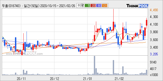 두올은 2019년 매출액 4659억원과 영업이익 276억원을 기록했다. 전년대비 매출은 -3.6%, 영업이익은 -9.9% 각각 하락했다. 이 회사의 매출액 증감률과 영업이익 증감률은 각각 코스피 하위 31%, 하위 41%에 해당된다.