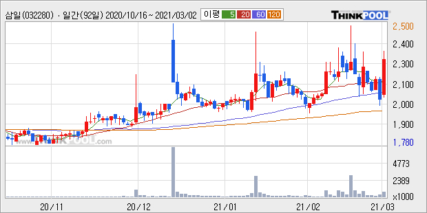 삼일은 2019년 매출액 962억원과 영업이익 25억원을 기록했다. 전년대비 매출은 -1.5%, 영업이익은 -24.5% 각각 하락했다. 이 회사의 매출액 증감률과 영업이익 증감률은 각각 코스닥 하위 36%, 하위 38%에 해당된다.