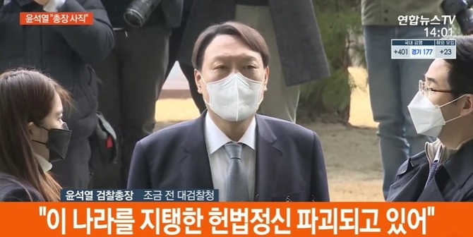 윤 총장은 "오늘 총장을 사직하려 한다. 이 나라를 지탱해온 헌법정신과 법치 시스템이 파괴되고 있다"고 말문을 열었다.