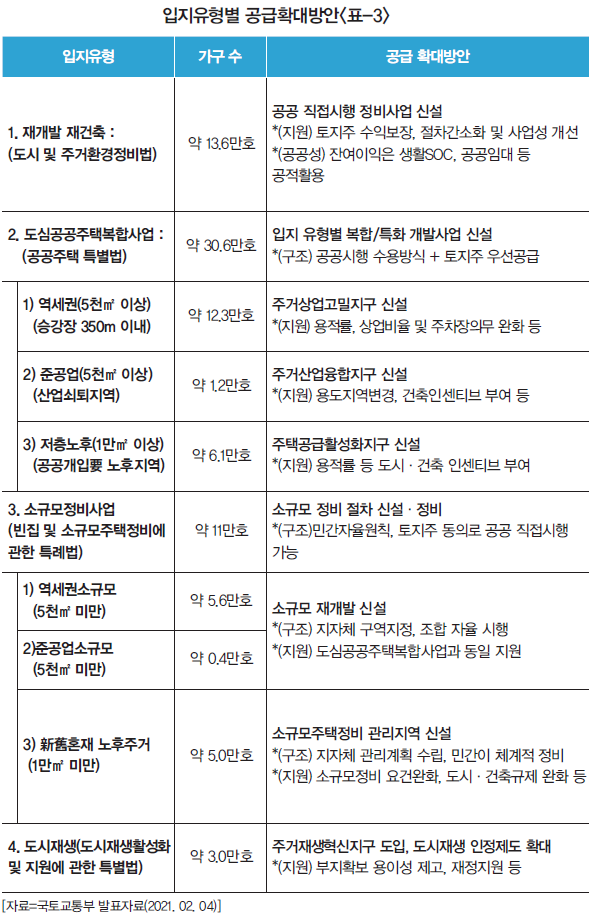그래서 이번에 정부는 <표-2>에서 보는 바와 같이 2021년부터 2025년까지 서울에 32만 3000가구를 포함해 전국적으로 83만 6000가구를 공급하겠다고 한다. 그 내용을 살펴보면 공공 직접 시행 정비사업 13만 6000가구, 도심공공주택 복합사업 19만 6000가구(역세권개발 12만 3000가구와 준공업지역 1만 2000가구, 저층주거지역 6만 1000가구), 소규모 정비사업 11만 가구, 공공택지 26만 3000가구 등 전국적으로 총 83만 6000가구다.