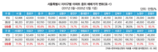 지난 2017년 5월부터 2020년 12월까지 약 3년 6개월 동안 서울의 자치구별 아파트 중위가격 변동을 한국부동산원 발표자료를 통해 분석해 보면 <표-1>에서 보는바와 같이 서울에서 가장 많이 상승한 지역은 강남4구도 아니고 마·용·성(마포, 용산, 성동구) 지역도 아닌 종로구다.