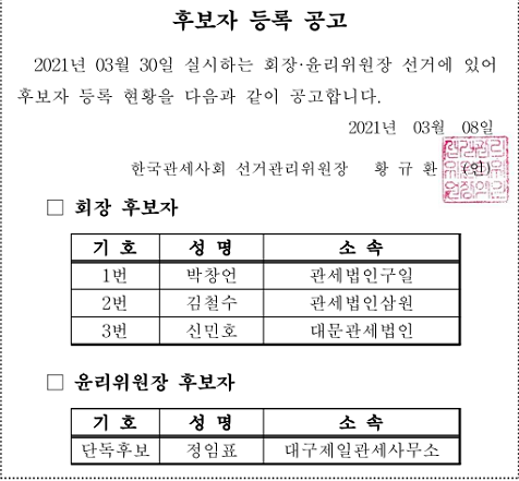 한편, 정임표 대구제일관세사무소 관세사는 윤리위원장에 단독 출마로 기호 1번을 받았다. 정 관세사는 국세청과 관세청 근무, 대구본부세관 관세심사위원, 관세청 관세심사위원, 법원행정처 소송전문 심리위원, 대구상공회의소 자문위원, 경상북도 FTA컨설팅 위원, 대구제일관세사무소 대표 등을 역임한 바 있다.