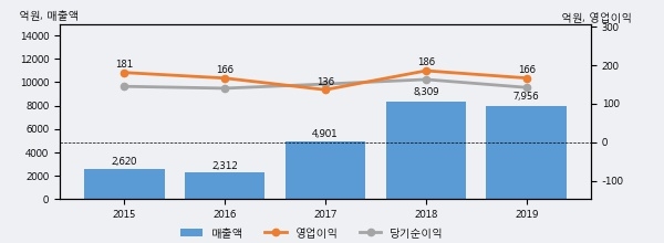 극동유화의 2019년 매출액은 전년대비 -4.3% 줄어든 7956억원이고, 영업이익 역시 전년대비 -10.3% 줄어든 166억원을 기록했다. 이 회사의 매출액 증감률과 영업이익 증감률은 각각 코스피 하위 29%, 하위 41%에 해당된다.