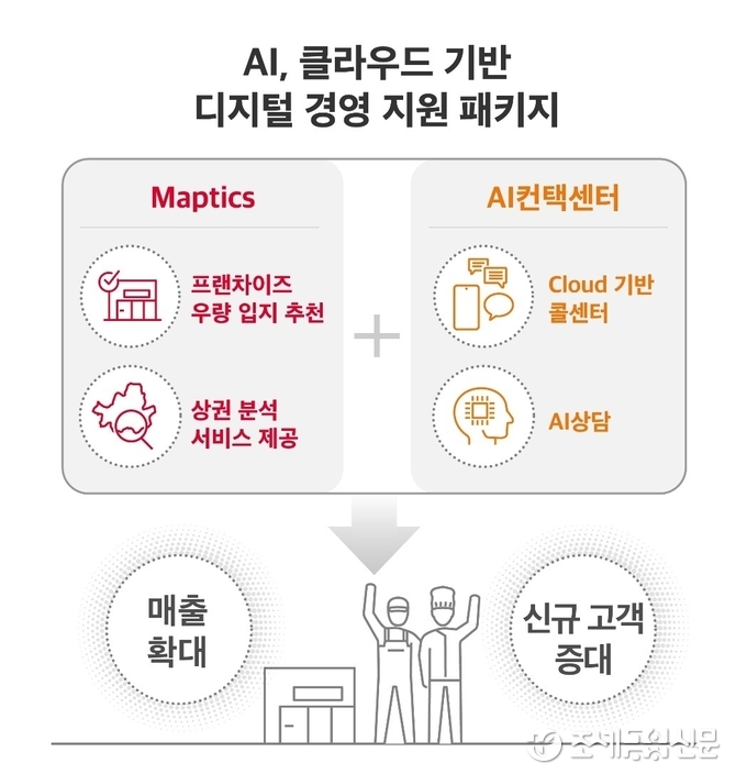 ‘맵틱스’는 유동 인구, 상권 특성, 상주 인구의 관심사, 배달 서비스 활용도 등 SKT가 보유한 막대한 빅데이터를 분석·제공하고, AI알고리즘이 입지 추천, 경영 전략 등을 추천해 주는 솔루션이다. 또 ‘AI컨택센터’는 클라우드를 기반으로 AI챗봇, AI음성봇 등을 제공, 가맹본부·가맹점이 구축 비용 부담 없이 효과적으로 고객응대를 할 수 있는 기능을 제공한다.