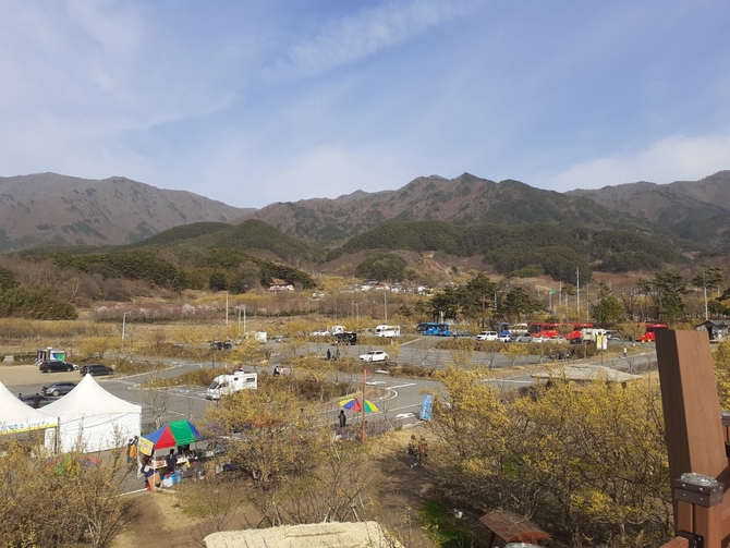 18일 오전 코로나19를 피해 구례 산수유마을을 찾은 차량들이 주차장을 채우고 있다. 지역 특산물인 산수유 막걸리와 쑥 부침개도 상춘객들의 벌걸음을 멈추게 한다.