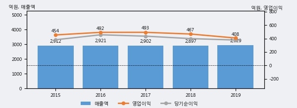 최근 실적을 살펴보면 2019년 매출액이 최근 5년 중 가장 높은 실적을 기록했음을 알 수 있다. 이전 최고 실적이었던 2016년 보다도 0.3%(7억 5천만원) 늘어난 것으로 나타났다.