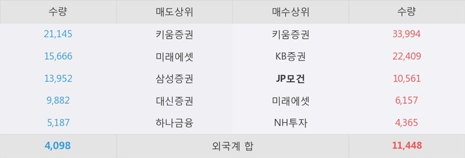 거래원 동향은 JP모건, 미래에셋, NH투자 등이 매수 상위 목록에 나타나고 있다.