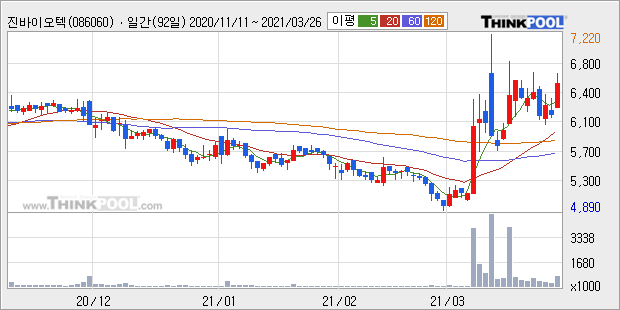 일봉 차트의 모습은 현재 단기·중기 이평선이 정배열 상태로 전형적인 상승세를 보이고 있다. 이 종목의 차트에서 최근에 최근 60일 매물대 돌파, 주가 5MA 상향돌파 등을 확인할 수 있다