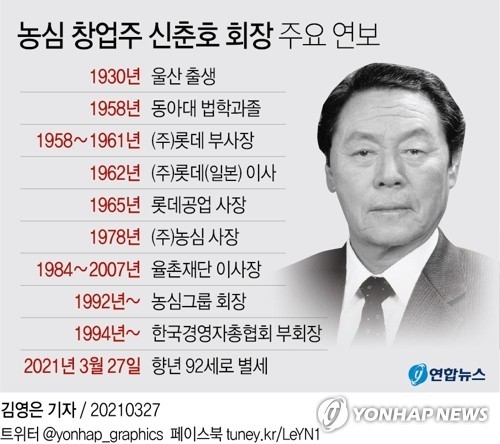 1930년 울산에서 태어난 신 회장은 1965년 농심을 창업한 이후 56년 동안 회사를 이끌어왔다. 신 회장은 롯데그룹 창업주인 고(故) 신격호 롯데그룹 명예회장의 둘째 동생이다.