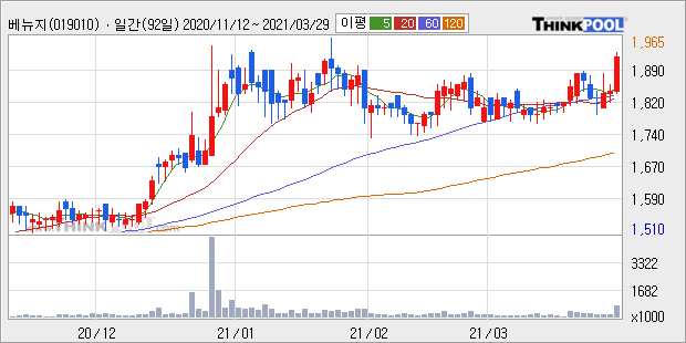 베뉴지의 2019년 매출액은 전년대비 12.6% 늘어난 590억원이고, 영업이익 또한 전년대비 195.1% 늘어난 60억원을 기록했다. 이 회사의 매출액 증감률과 영업이익 증감률은 각각 코스닥 상위 35%, 상위 9%에 해당된다.