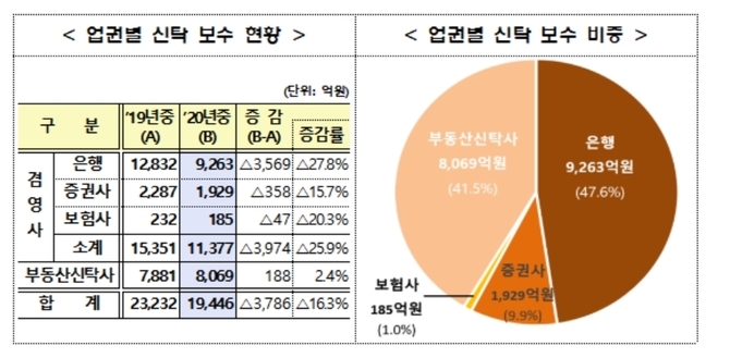 작년에 금융사들이 벌어들인 신탁보수는 총 1조9천446억원으로 전년 대비 16.3% 감소했다. 은행과 증권사는 주가연계신탁 보수가, 부동산신탁사는 차입형 토지신탁 보수가 크게 줄었다.