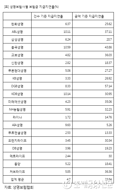 4일 각 보험사 공시에 따르면 작년 하반기 생명보험 각사의 지급 지연율은 지급액 기준으로 상반기 평균 25.78%, 하반기 평균 23.84%로 각각 집계됐다.