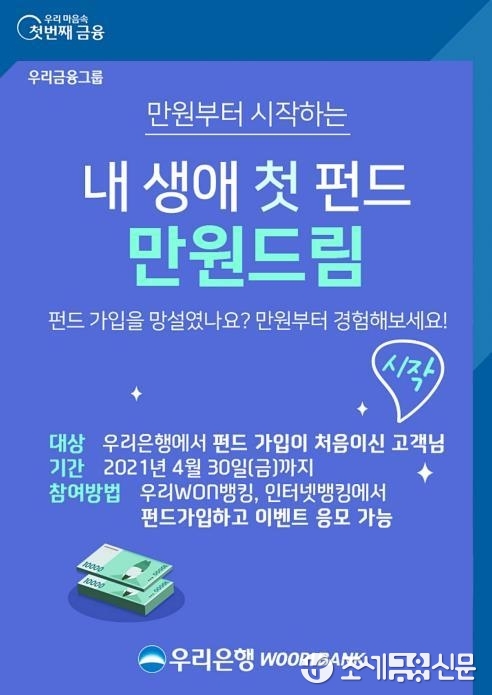 (조세금융신문=최주현 기자) 우리은행은 생애 처음 펀드를 가입하는 고객에게 추첨을 통해 1만원을 지급하는 '만원부터 시작하는 내 생애 첫 펀드' 이벤트를 실시한다.
