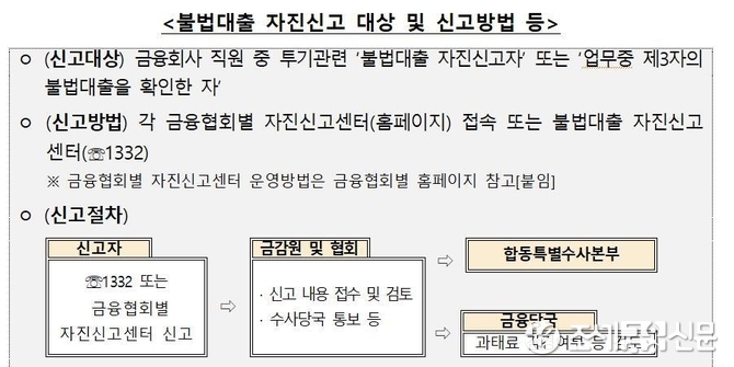 신고 대상은 금융회사 직원 중 투기 관련 불법 대출을 자진 신고하는 사람, 업무 중 제3자의 불법 대출을 확인한 사람 등이다.