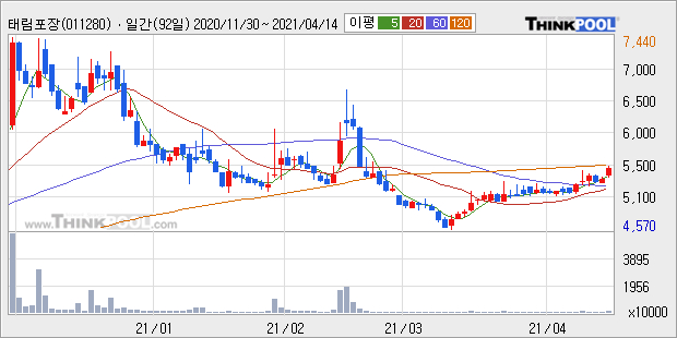 태림포장의 2020년 매출액은 전년대비 -1.9% 줄어든 5620억원이고, 영업이익 역시 전년대비 -54.2% 줄어든 95억원을 기록했다. 이 회사의 매출액 증감률과 영업이익 증감률은 각각 코스피 상위 48%, 하위 24%에 해당된다.