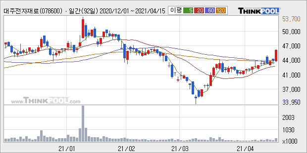 대주전자재료는 2020년 매출액 1545억원과 영업이익 90억원을 기록했다. 전년대비 매출은 32.8%, 영업이익은 239.1% 각각 상승했다. 이 회사의 매출액 증감률과 영업이익 증감률은 각각 코스닥 상위 15%, 상위 9%에 해당된다.