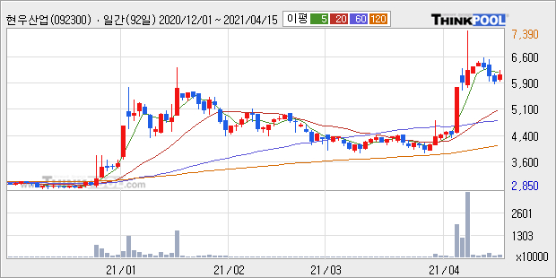 일봉 차트의 모습은 현재 단기·중기 이평선이 정배열 상태로 전형적인 상승세를 보이고 있다. 이 종목의 차트에서 최근에 최근 60일 매물대 돌파, 주가 5MA 상향돌파 등을 확인할 수 있다
