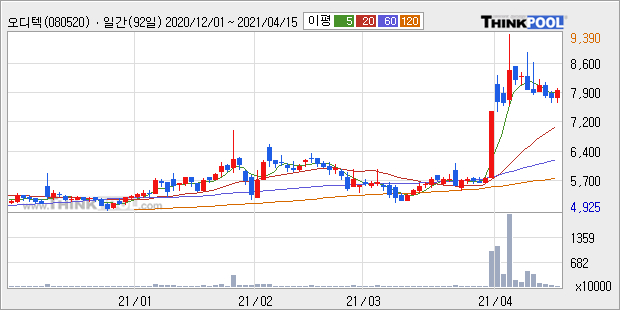 오디텍은 2020년 매출액 422억원과 영업이익 13억원을 기록했다. 전년대비 매출은 1.4%, 영업이익은 9.2% 각각 상승했다. 이 회사의 매출액 증감률과 영업이익 증감률은 각각 코스닥 상위 47%, 상위 46%에 해당된다.