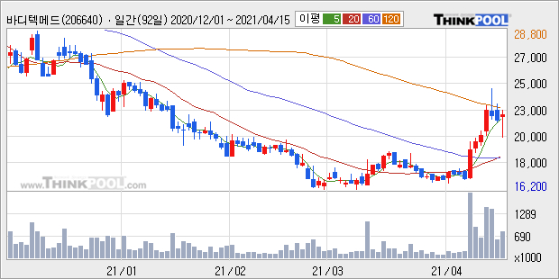 바디텍메드의 2020년 매출액은 전년대비 98.0% 늘어난 1441억원이고, 영업이익 또한 전년대비 339.5% 늘어난 660억원을 기록했다. 이 회사의 매출액 증감률과 영업이익 증감률은 각각 코스닥 상위 5%, 상위 6%에 해당된다.