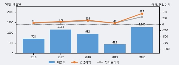 최근 실적을 살펴보면 2020년 매출액이 최근 5년 중 가장 높은 실적을 기록했음을 알 수 있다. 이전 최고 실적이었던 2017년 보다도 9.4%(108억 8천만원) 늘어난 것으로 나타났다.