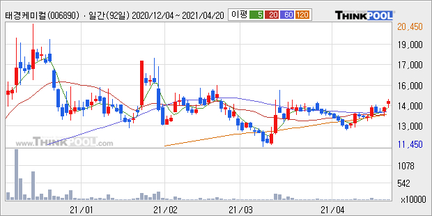 태경케미컬의 2020년 매출액은 471억으로 전년대비 12.5% 상승했고, 영업이익 또한 77억으로 전년대비 547.1% 상승했다. 이 회사의 매출액 증감률과 영업이익 증감률은 각각 코스피 상위 15%, 상위 2%에 해당된다.