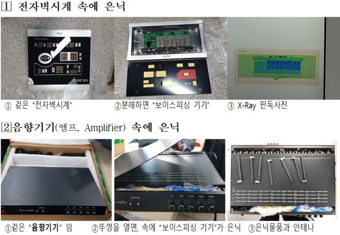 포장을 열면 정상적인 '전자벽시계' 또는 '앰프'가 있지만, 나사볼트를 풀고 그 속을 열어보면 '보이스피싱 기기'가 은닉되어 있다.