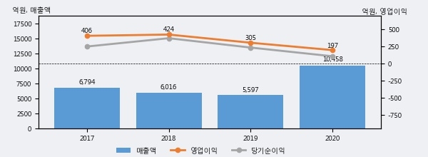 최근 실적을 살펴보면 2020년 매출액이 최근 4년 중 가장 높은 실적을 기록했음을 알 수 있다. 이전 최고 실적이었던 2017년 보다도 53.9%(3664억 2천만원) 늘어난 것으로 나타났다.