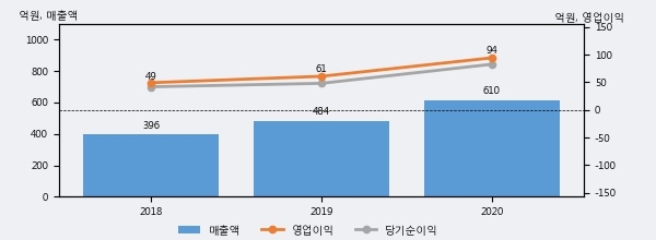 최근 실적을 살펴보면 2020년 매출액이 최근 3년 중 가장 높은 실적을 기록했음을 알 수 있다. 이전 최고 실적이었던 2019년 보다도 26.2%(126억 7천만원) 늘어난 것으로 나타났다.