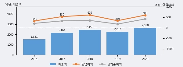 최근 실적을 살펴보면 2020년 매출액이 최근 5년 중 가장 높은 실적을 기록했음을 알 수 있다. 이전 최고 실적이었던 2018년 보다도 6.6%(163억 2천만원) 늘어난 것으로 나타났다.