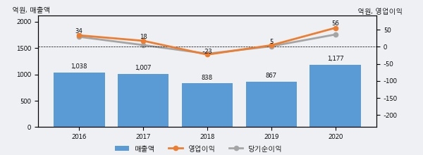 최근 실적을 살펴보면 2020년 매출액이 최근 5년 중 가장 높은 실적을 기록했음을 알 수 있다. 이전 최고 실적이었던 2016년 보다도 13.4%(138억 7천만원) 늘어난 것으로 나타났다.