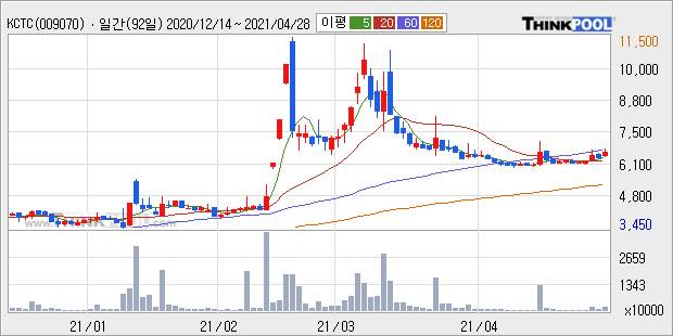 KCTC의 2020년 매출액은 전년대비 9.5% 늘어난 4887억원이고, 영업이익 또한 전년대비 10.3% 늘어난 210억원을 기록했다. 이 회사의 매출액 증감률과 영업이익 증감률은 각각 코스피 상위 18%, 상위 45%에 해당된다.