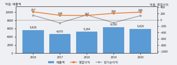 동방의 2020년 매출액은 5920억으로 전년대비 -6.5% 하락했고, 영업이익은 246억으로 전년대비 17.4% 상승했다. 이 회사의 매출액 증감률과 영업이익 증감률은 각각 코스피 하위 40%, 상위 40%에 해당된다.