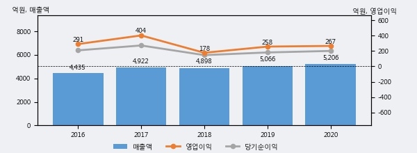 최근 실적을 살펴보면 2020년 매출액이 최근 5년 중 가장 높은 실적을 기록했음을 알 수 있다. 이전 최고 실적이었던 2019년 보다도 2.8%(140억 3천만원) 늘어난 것으로 나타났다.