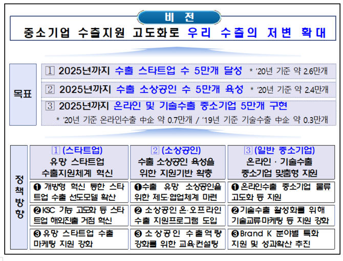 정부의 2025년 까지의 목표는 수출 스타트업 5만개, 소상공인 5만개, 온라인 및 기술수출 중소기업 5만개를 구현할 계획이다.