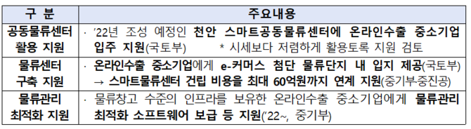온라인 수출 중소기업의 공동물류센터 활용, 자체 물류센터 건립, 물류관리 최적화 등 물류고도화 패키지를 지원한다.