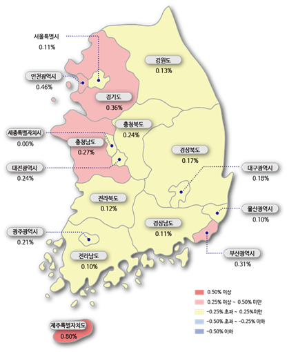 전국 기준으로는 6주 연속 0.23%를 지속하다가 7주 만에 0.25%로 오름폭을 확대했다. 5대 지방 광역시(대전·대구·부산·울산·광주)도 0.22%에서 0.23%로 상승 폭을 키웠다.