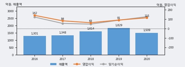 코프라는 2020년 매출액 1509억원과 영업이익 115억원을 기록했다. 전년대비 매출은 -17.5% 하락했고, 영업이익은 26.3% 상승했다. 이 회사의 매출액 증감률과 영업이익 증감률은 각각 코스닥 하위 22%, 상위 37%에 해당된다.