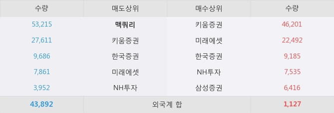 거래원 동향은 미래에셋, NH투자, 삼성증권 등이 매수 상위 목록에 나타나고 있다. 한편, 매도 창구 상위에는 맥쿼리가 눈에 띄고 있다.