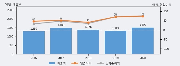 최근 실적을 살펴보면 2020년 매출액이 최근 5년 중 가장 높은 실적을 기록했음을 알 수 있다. 이전 최고 실적이었던 2017년 보다도 0.6%(9억 5천만원) 늘어난 것으로 나타났다.