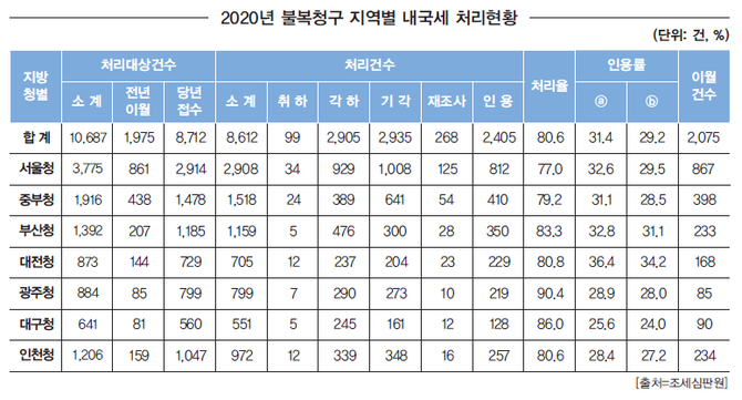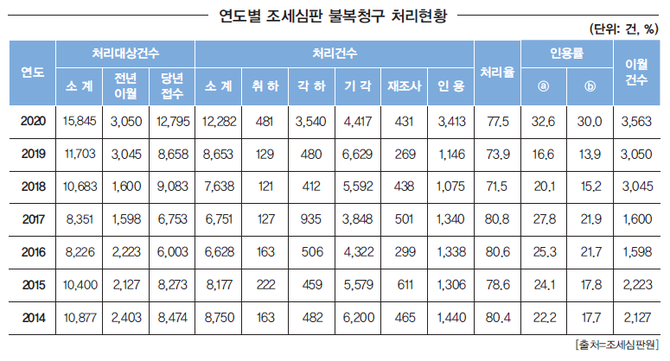 2020년 조세심판통계연보에 따르면 ▲내국세 심판청구 접수건수는 1만 687건에 8612건이 처리되어 29.2%의 인용률을 보였고 ▲관세의 경우 접수건수 288건에 217건이 처리되어 35.2%의 인용률이 나타났다. 또 ▲지방세의 경우 접수건수 5243건에 4258건을 처리, 인용률이 5.4%에 불과한 실정으로 밝혀졌다.