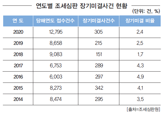 또한 2020년에 접수된 당해 연도 접수건수 1만2795건 중에서 305건이 장기미결사건으로 장기미결비율이 2.4%로 밝혀졌다. 청구일부터 1년이 경과하였는데도 불구하고 처리되지 않은 사건인 장기미결사건은 일반적으로 건별사건의 난이도가 높기 때문이라는 분석이지만, 청구인 등이 불복청구 주장 등의 사실관계 의견이 새로 추가됨에 따라 생기는 경우도 있다고 한다.